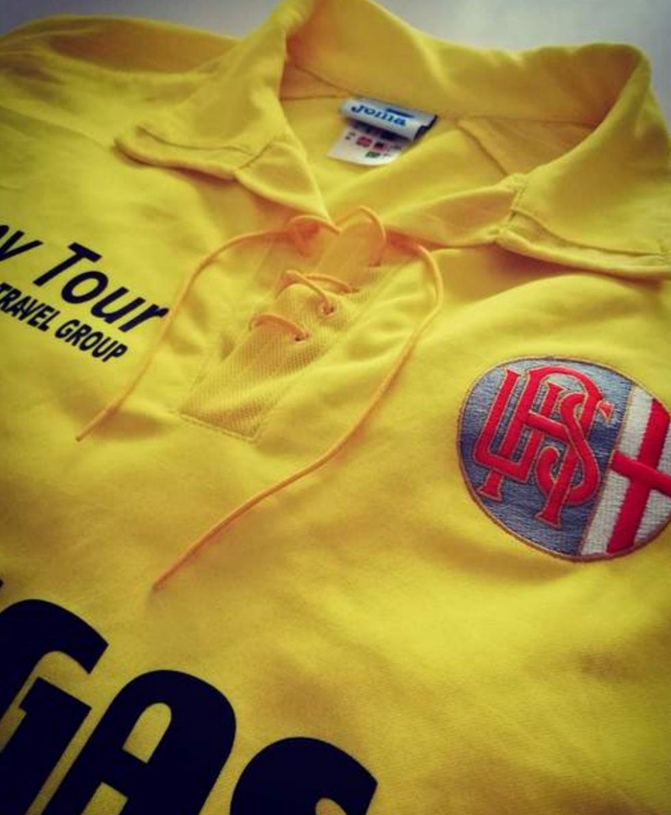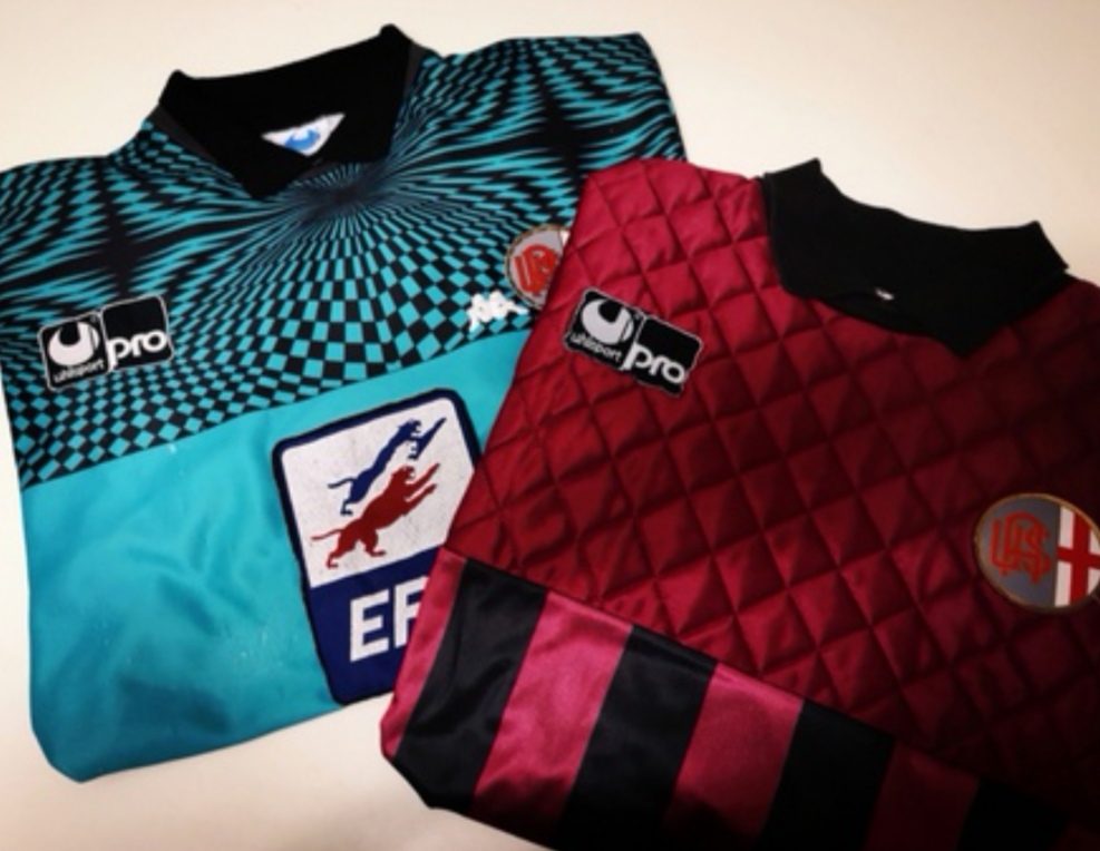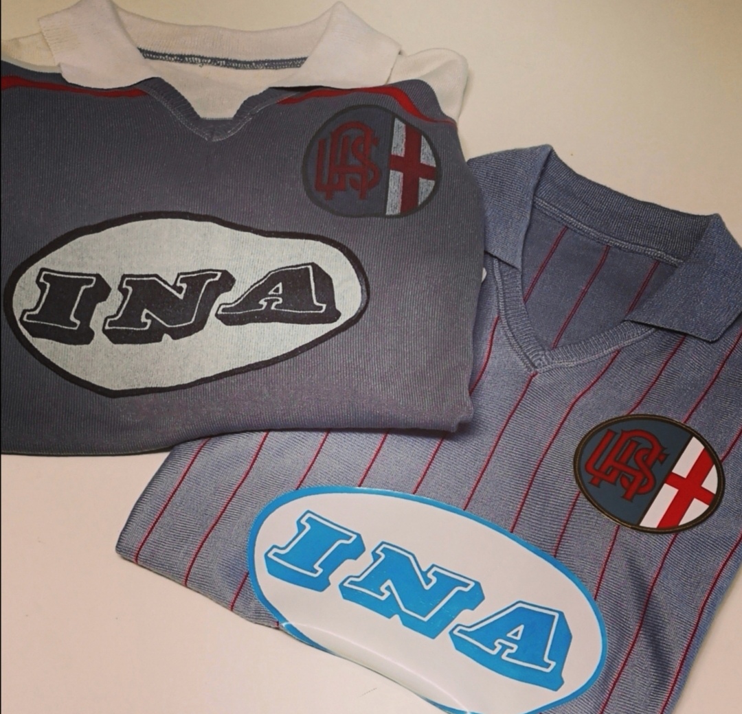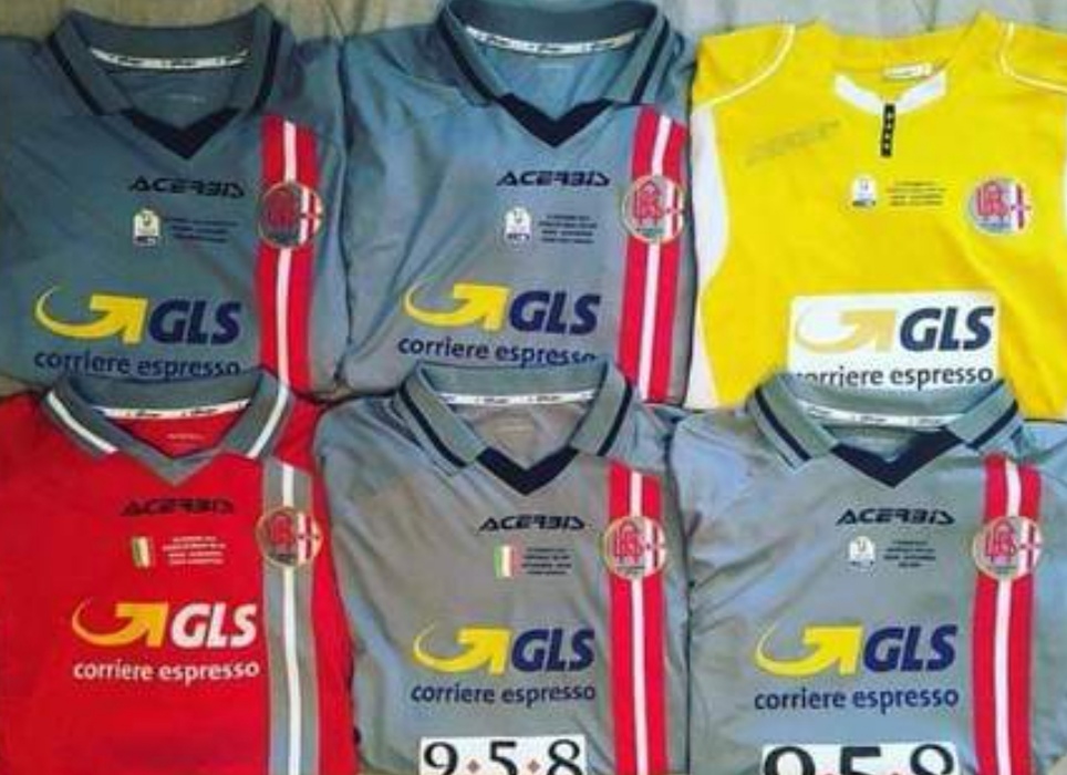 Ecco spuntare questa insolita casacca Errea, di colore blu, bordeaux e grigio, trasformata per l' occasione in divisa da gioco grazie all' applicazione dello stemma societario sul petto.
