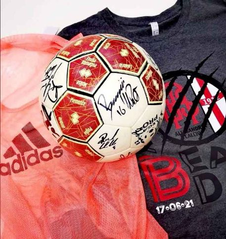 Nella foto uno dei palloni della gara autografato da tutta la rosa, la pettorina indossata dai giocatori in panchina e la maglia celebrativa usata dalla squadra per i festeggiamenti.